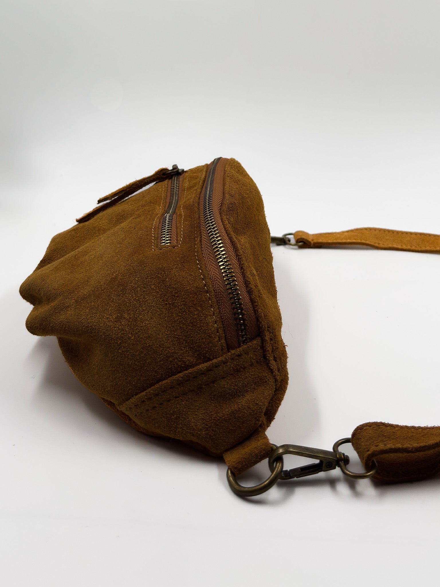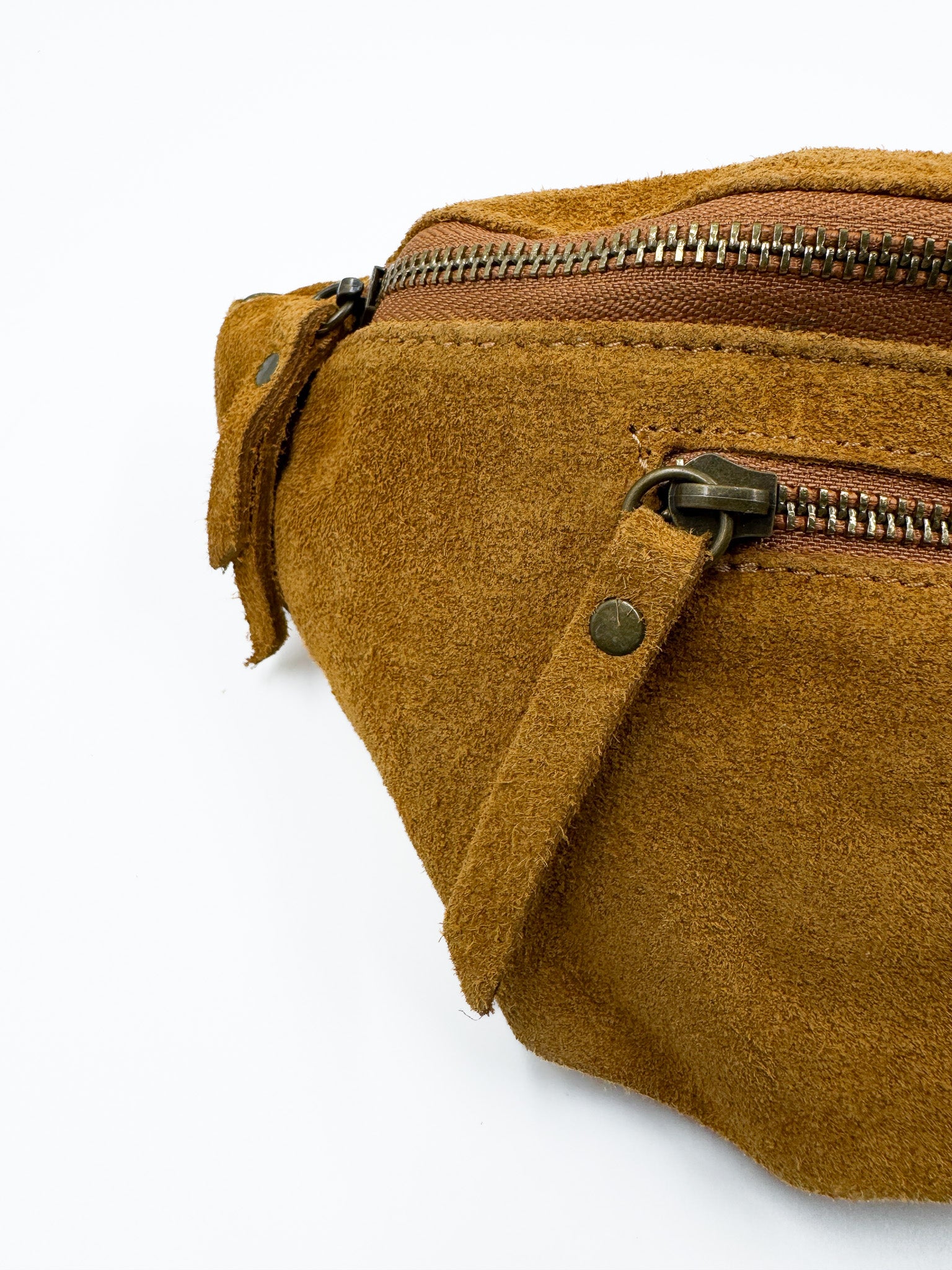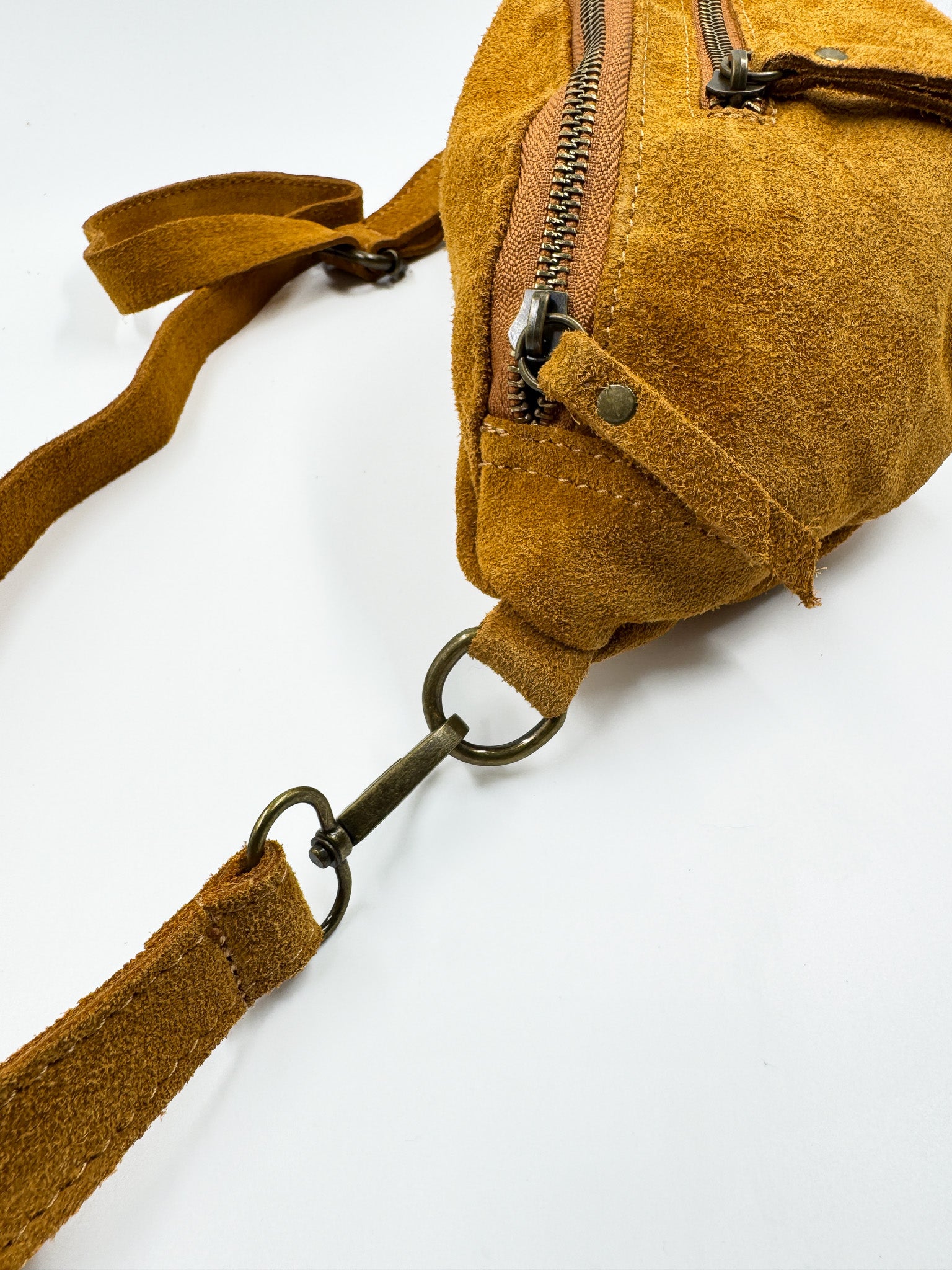 Riñonera o banano de cuero. Dígale como prefiera. Un ícono ochentero, esta vez en versión gamuza. Interior con forro y bolsillo pequeño, ideal para tarjetas o llaves. Correa ajustable. La puedes usar al hombro o cruzada. Lo más cómodo para ir de viaje o salida de compras, con tus indispensables.