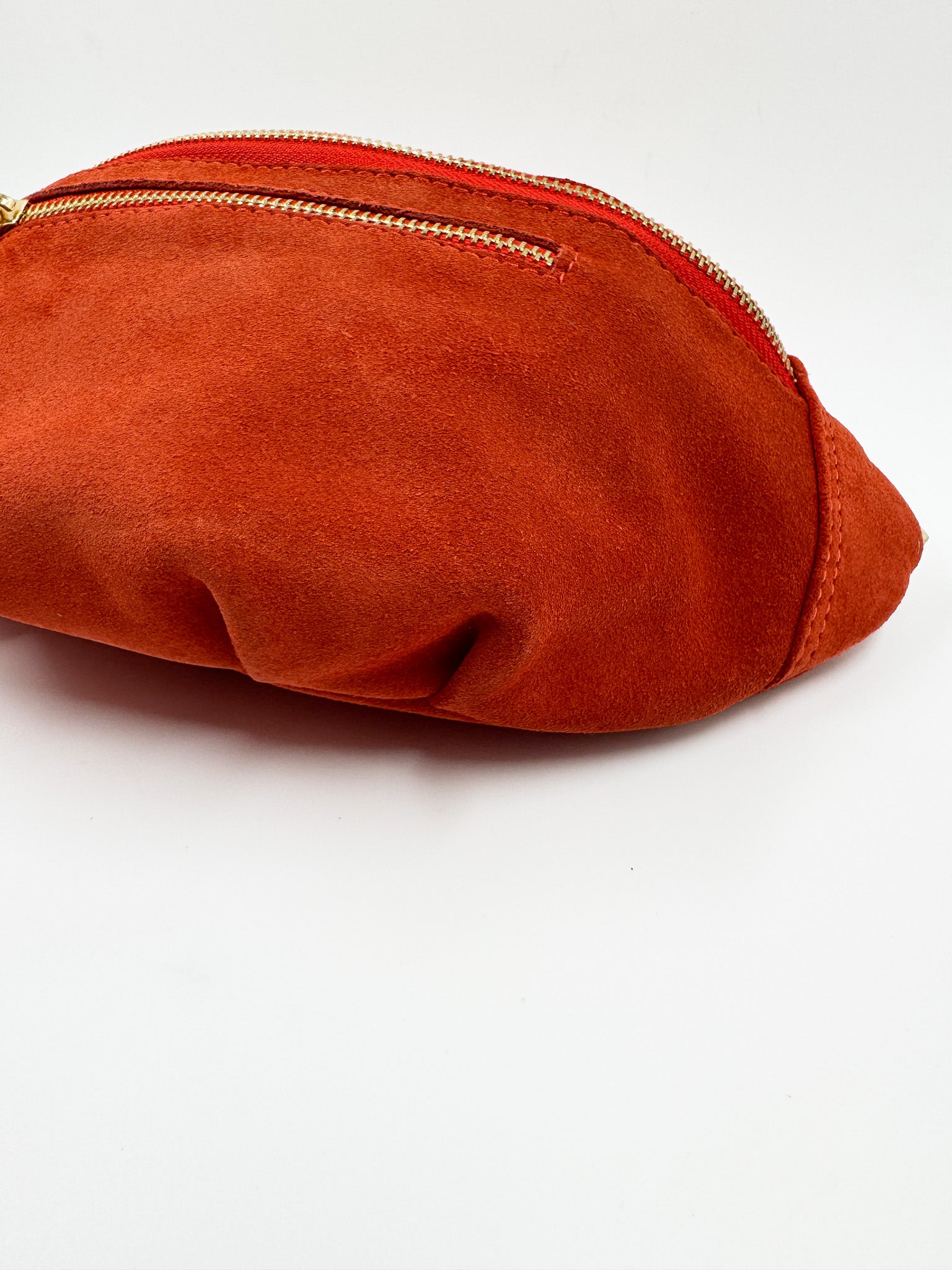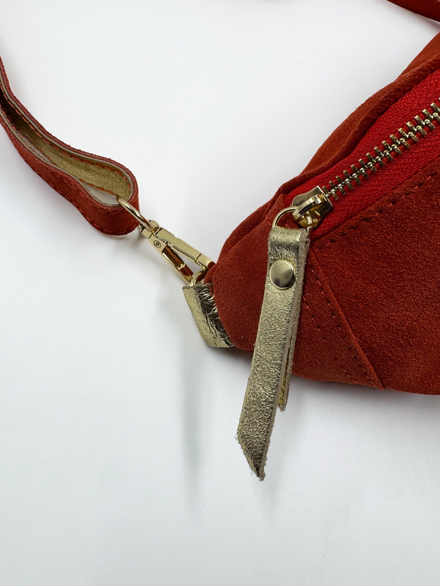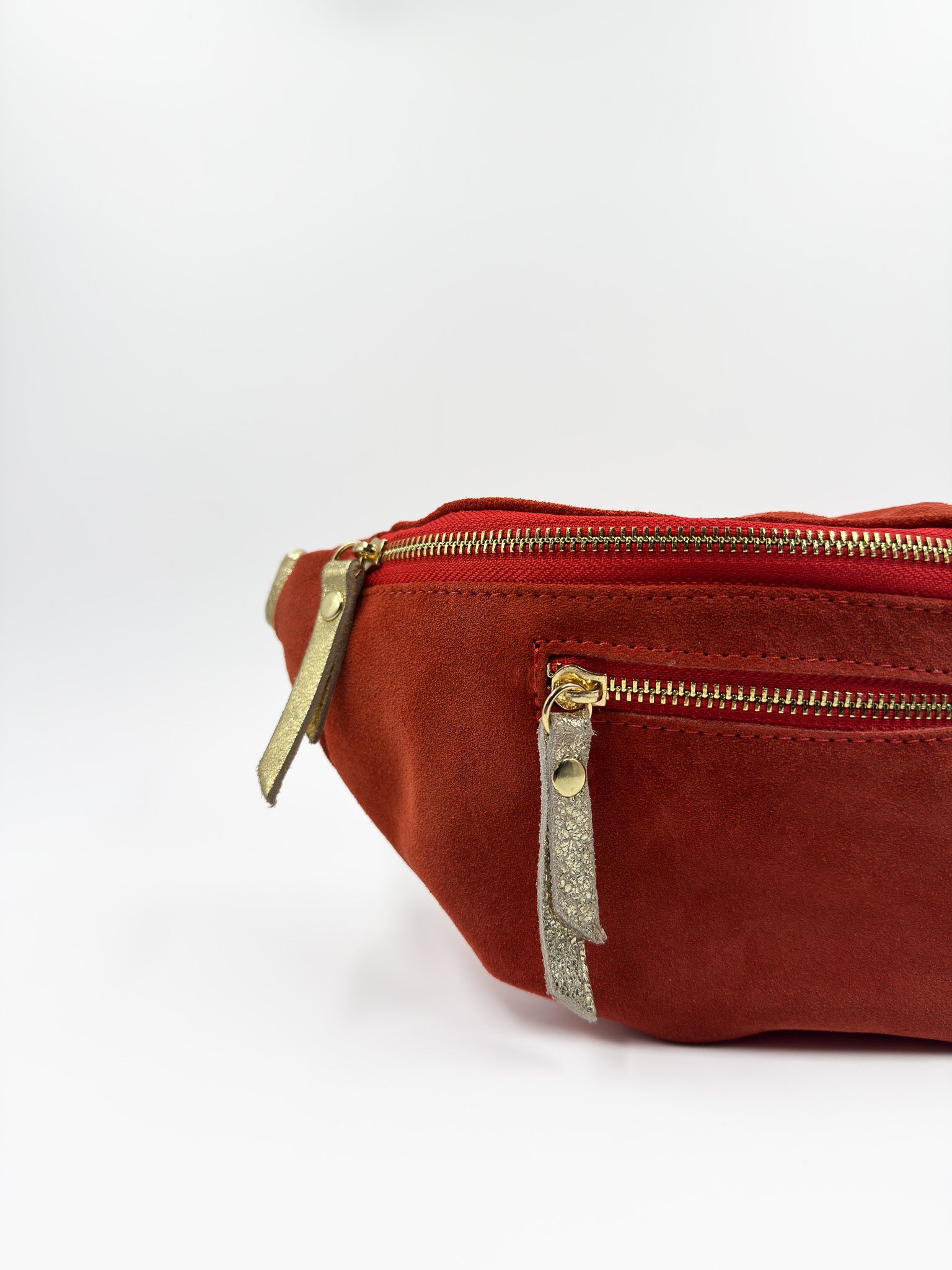 Riñonera o banano de cuero. Un ícono esta vez en versión gamuza. Interior con forro y bolsillo pequeño, ideal para tarjetas o llaves. Correa ajustable. La puedes usar al hombro o cruzada. Lo más cómodo para ir de viaje o salida de compras, con tus indispensables.