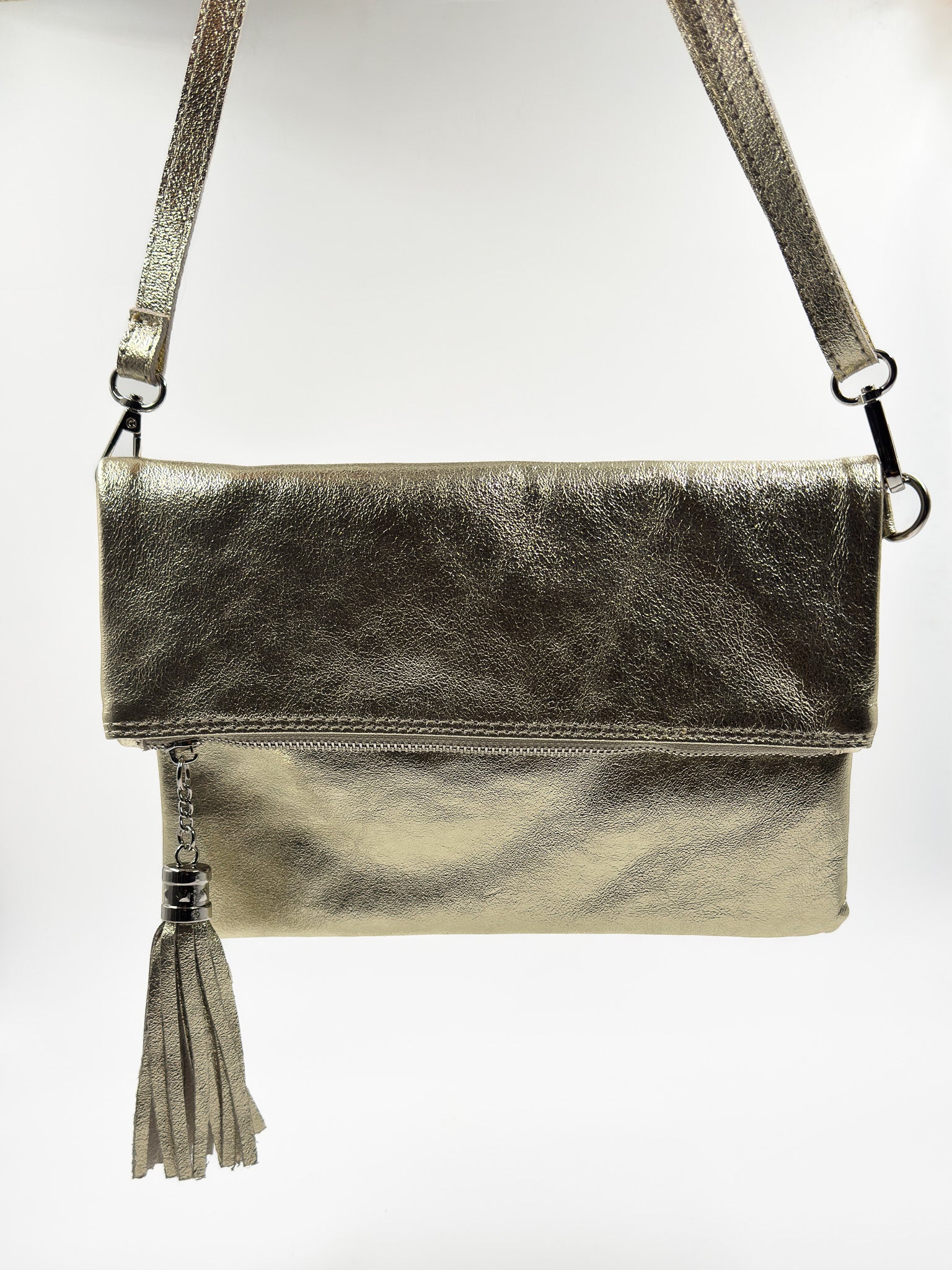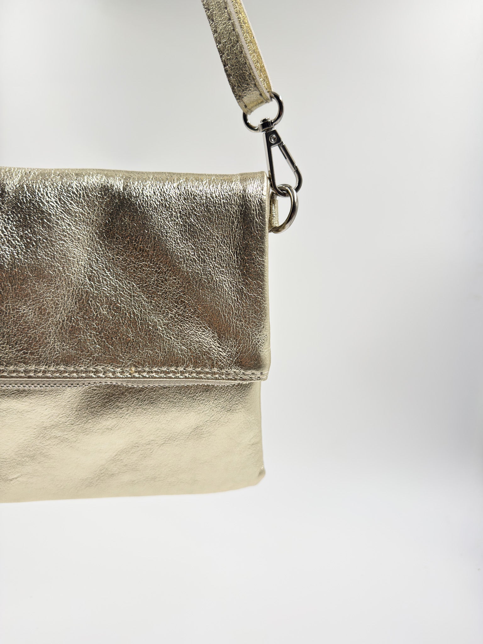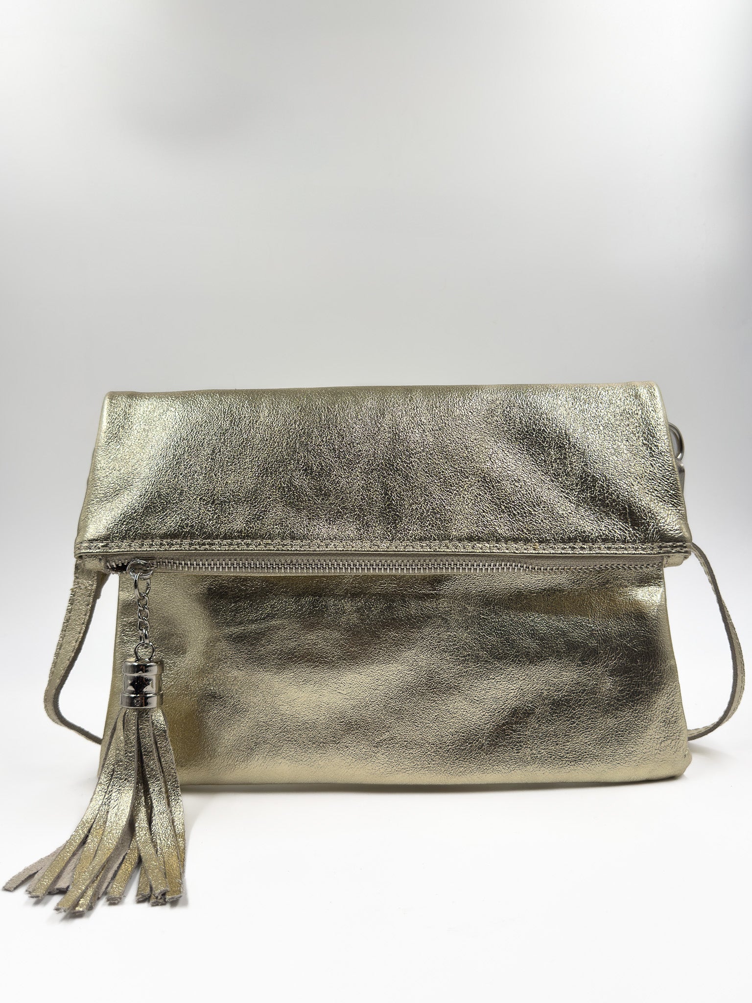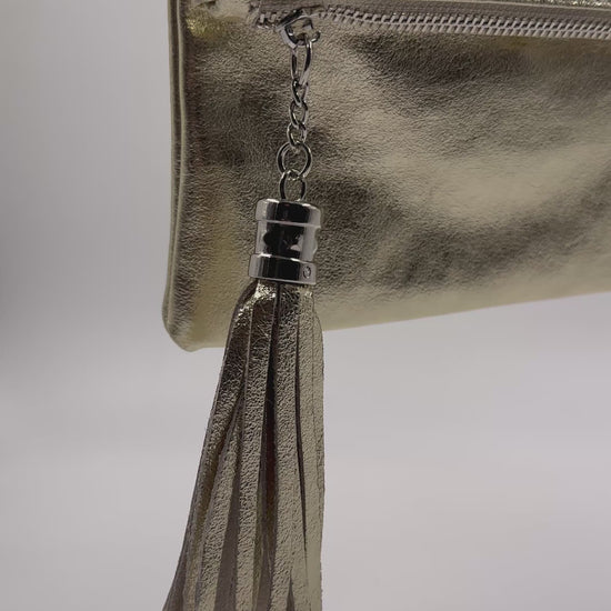 Si te vas de fiesta esta es tu cartera! Confeccionada en cuero metalizado, pensada para llevar lo esencial. La puedes usar como sobre o clutch en mano o como bandolera con correa.