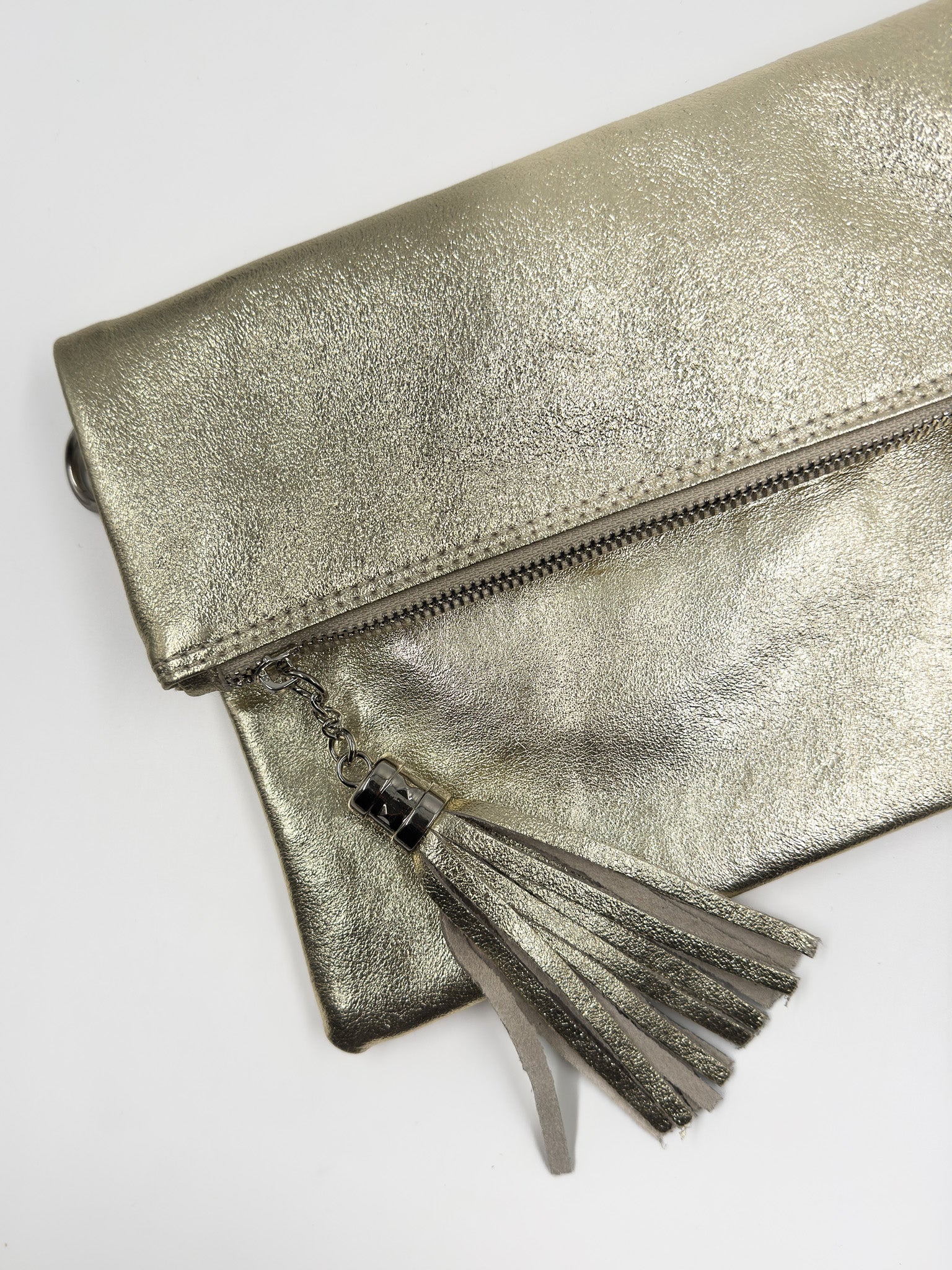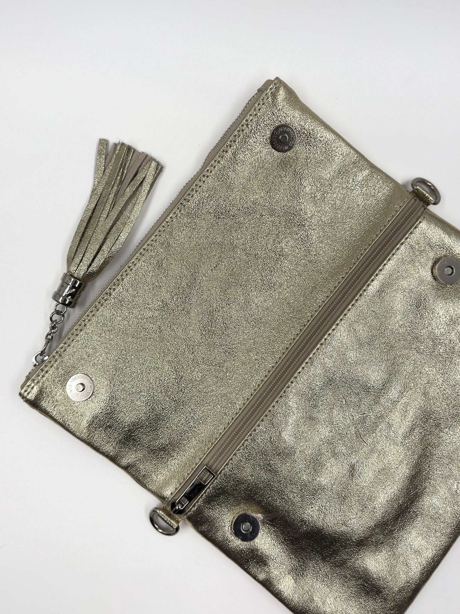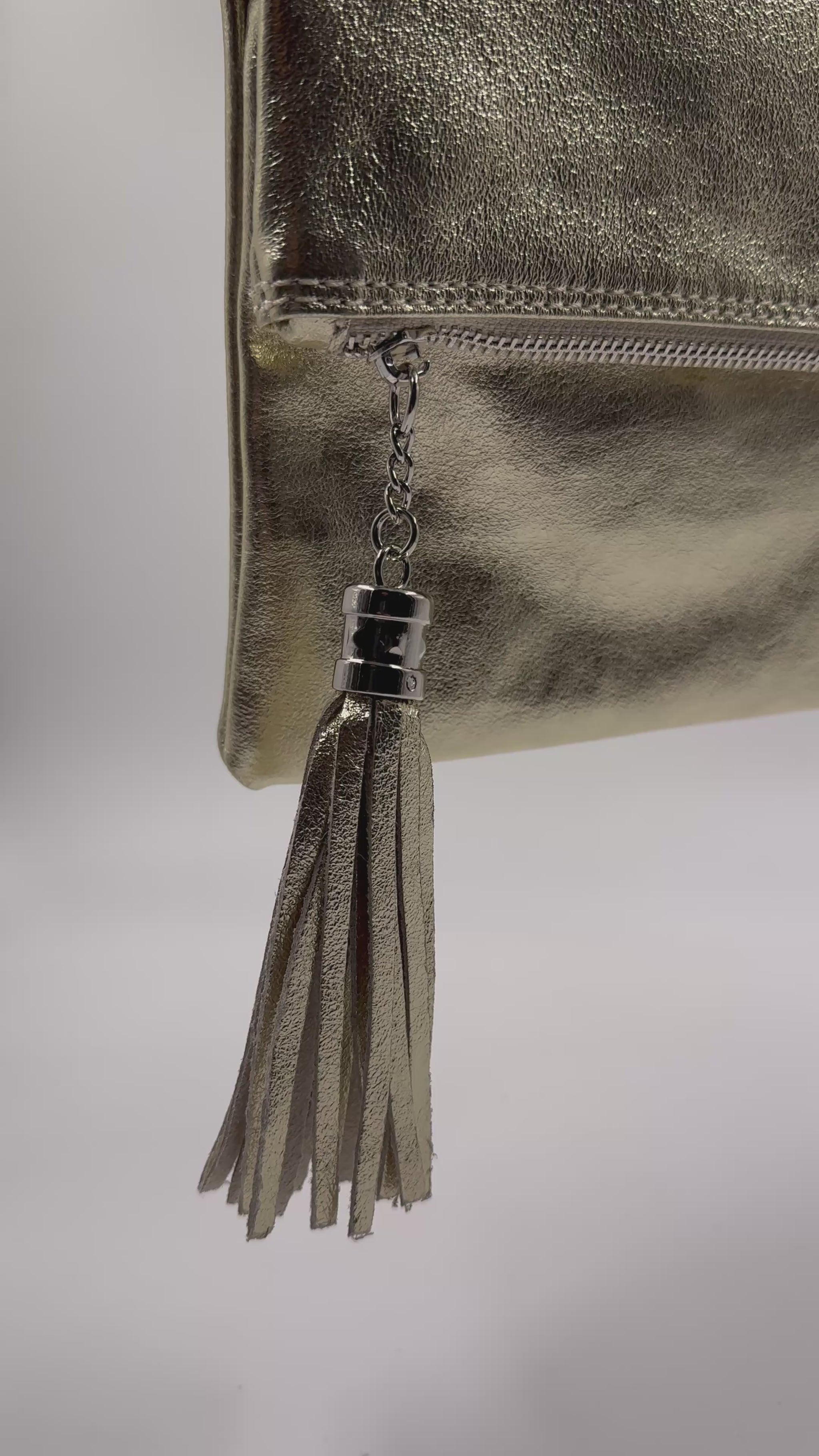 Si te vas de fiesta esta es tu cartera! Confeccionada en cuero metalizado, pensada para llevar lo esencial. La puedes usar como sobre o clutch en mano o como bandolera con correa.