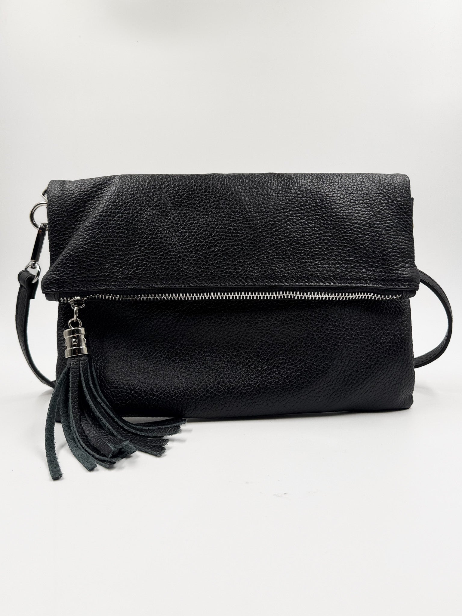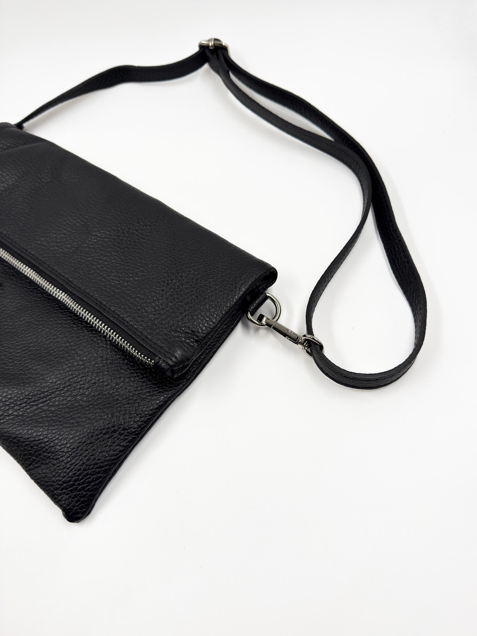 Si te vas de fiesta esta es tu cartera! Confeccionada en cuero graneado, pensada para llevar lo esencial. La puedes usar como sobre o clutch en mano o como bandolera con correa.